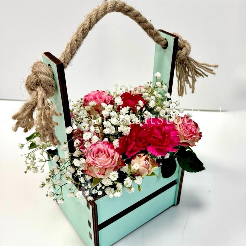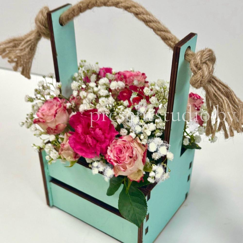 Нежная композиция из цветов в деревянном ящике. heart Хорошее дополнение к любому подарку из нашего каталога.